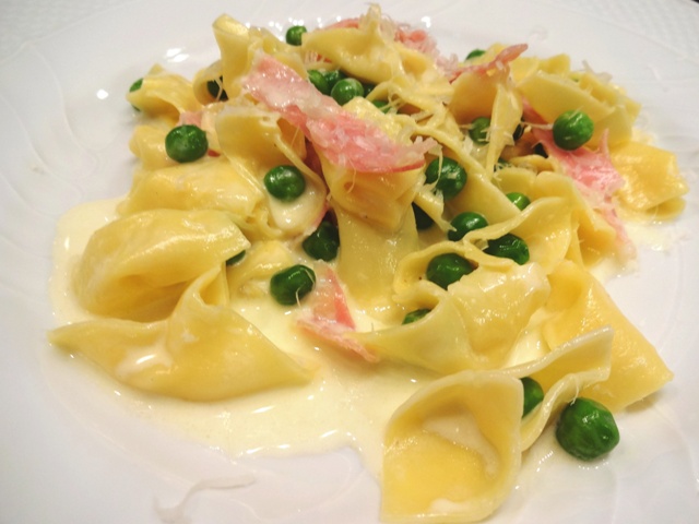 Conchiglie con panna, prosciutto e piselli