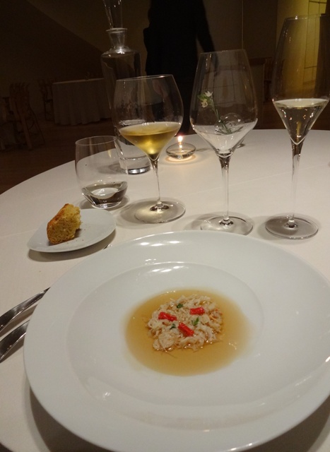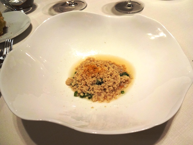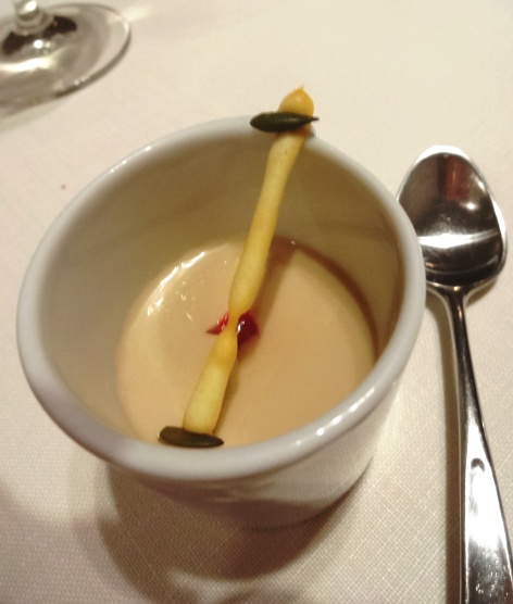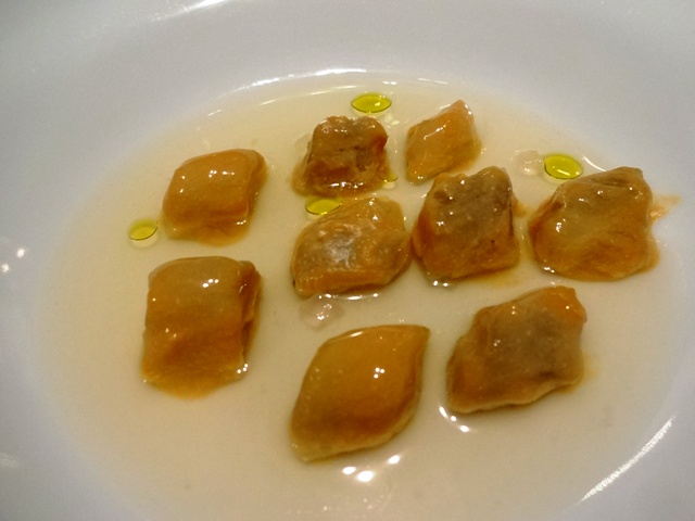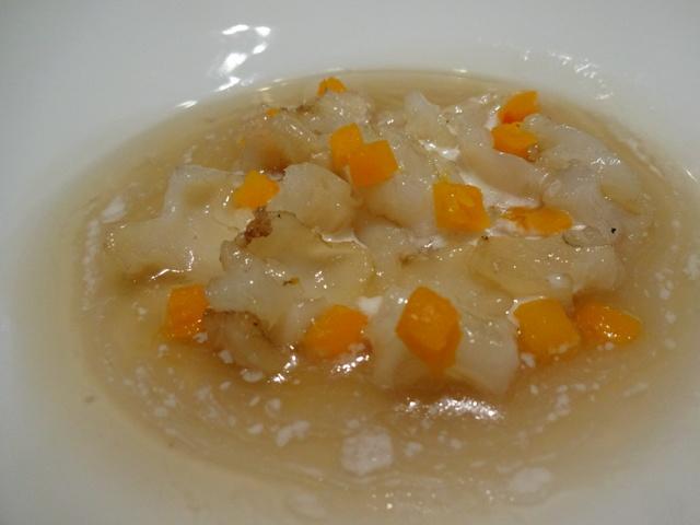 塩鱈(バッカラ)の胃袋、アーモンド、蟹の出汁、かぼちゃ