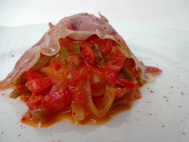 「ピペラド」とはフランスとスペイン国境にまたがるバスク地方の伝統料理でイタリアのカポナータとフランスのラタトゥ イユを足して2で割ったようなお料理です。旅で持ち帰ったバスク特有の「ピマン・デスペレット」という唐辛子を加えてピリッと。