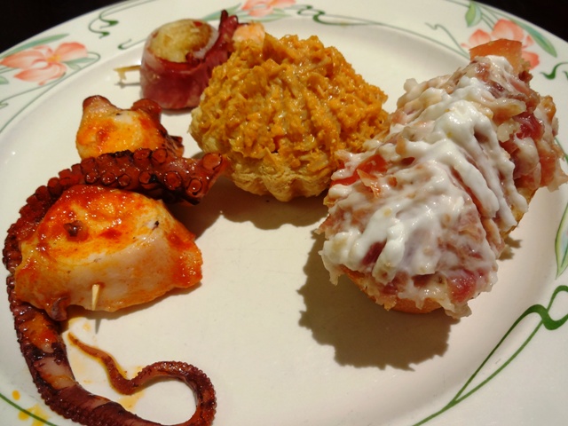 タコのガリシア風、クモガニのパイ、ハモンイベリコのピンチョス