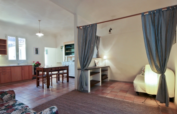 リヴィングの一角がカーテンで仕切れるようになっていて、そこにあるソファーもダブルベッドになります。洗面所にはビデとトイレとシャワーそして洗濯機。広いキッチンには4口コンロにオーブン、冷蔵庫も完備。4名まで滞在できるアパートです。